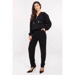 Tento volný dámský set je ideální nabídkou na chladnější dny, stylový, pohodlný a příjemně obepínající. Vyrobený z kvalitní směsi vlny, viskózy, angory a polyesteru, poskytuje vynikající tepelný komfort, měkkost a odolnost. Mikina se zapínáním na zip má praktickou kapuci, dlouhý rukáv a velké nášivky kapsy na přední straně, které dodávají charakter a funkčnost. Její jednoduchý, hladký vzor se skvěle hodí k různým doplňkům a osvědčí se jak doma, tak při procházce. Kalhoty s dlouhými, zužujícími se nohavicemi mají vysoký pas a šňůrku v pase, díky čemuž skvěle padnou ke siluetě. Boční, vsunuté kapsy přidávají praktičnost bez narušení minimalistické formy. Tento set je ideální na každodenní aktivity, spojuje volnost pohybu, teplo a módní vzhled v jednom outfitu.