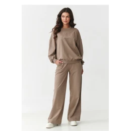 Vsadíme na spojení pohodlí a módního vzhledu s dámským teplákovým kompletem, který se skvěle hodí jak na každý den, tak na volný čas či odpočinek doma. Vyrobený z měkké, prodyšné pleteniny složené z 95 % bavlny a 5 % elastanu zaručuje pohodlné nošení a skvělé přizpůsobení postavě bez omezování pohybu. Horní část setu je klasická mikina s kulatým výstřihem a jemně sníženou linií ramen. Má lehce oversized střih, který stylizaci dodává volnost a moderní charakter. Její výjimečnost zdůrazňuje vyšívaná aplikace s logem na přední straně, která celku dodává originalitu a decentní styl. Kalhoty se vyznačují módním střihem s širokými nohavicemi, které se krásně skládají při pohybu a dodávají postavě lehkost a vyváženost proporcí. Elastický pas a praktické kapsy zvyšují funkčnost a pohodlí nošení. Ideální volba na každou roční dobu, teplákový set s širokými nohavicemi a vyšíváním je must-have v ženské skříni