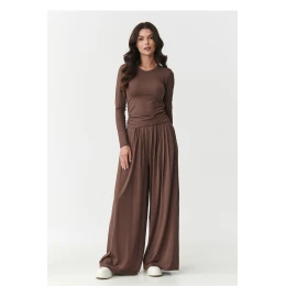 Tento set je ideální nabídkou pro ženy, které hledají spojení pohodlí, stylu a jemnosti. Vyrobený z měkké, příjemné na dotek viskózy se perfektně přizpůsobuje postavě, poskytuje volnost pohybu a pohodlí po celý den. Vrchní část setu tvoří přiléhavý top s dlouhým rukávem, který se vyznačuje decentními záhyby po stranách. Tento ženský detail nejen zdůrazňuje pas, ale také dodává celku elegantní, avšak nenápadný charakter. Toto spojení jednoduchosti s módním detailem z ní činí skvělou volbu nejen jako součást setu, ale také samostatně v mnoha stylizacích. Široké, volně padající kalhoty zaručují pohodlí a styl v jednom. Díky elastickému pasu a volnému střihu se skvěle hodí do pohybu, a boční kapsy jim dodávají funkcionalitu. Jedná se o ideální střih jak pro nošení doma, tak i ve streetových stylizacích. Dámský set je k dispozici v módních, univerzálních barvách: antracitová, černá, čokoládová, khaki a bordová. vsaď