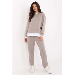 Dámska súprava na bežné nosenie z mäkkého plátenného materiálu, jemného a mimoriadne príjemného na dotyk. Súprava pozostáva z mikiny s okrúhlym výstrihom a nohavíc s vysokým pásom, ktoré vytvárajú pohodlný a štýlový outfit na každý deň. Mikina má dlhé rukávy, výstrih a spodný okraj lemovaný kontrastnou látkou a jemnú aplikáciu. Nohavice s rovnými nohavicami majú vysoký pás so šnúrkou na stiahnutie a bočné vrecká, čo zaručuje pohodlie a moderný strih. Hladký vzor a kombinácia viskózy a elastanu zaručujú mäkkosť, pružnosť a voľnosť pohybu. Táto súprava je ideálna na každodenné nosenie, spája pohodlie, eleganciu a ležérny štýl.
