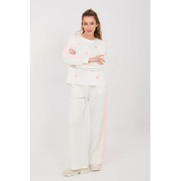 Tento dámský dresový set skládající se z mikiny a kalhot je ideální nabídkou na každý den pro ženy, které ocení pohodlí, volnost pohybu a módní, ležérní styl. Měkký materiál typu mikina je neuvěřitelně jemný a příjemný na dotek, díky čemuž se set skvěle hodí jak pro domácí relaxaci, tak pro každodenní vycházky. Mikina s dlouhým rukávem s pruhem byla ozdobena decentním motivem srdíček na přední straně, což přidává celku ženský a dívčí charakter. Široké nohavice kalhot s módními pruhy opticky zúžují postavu, a vysoký pas krásně zdůrazňuje pas a zajistí pohodlné nošení. Nastavitelný pás s šňůrkami umožňuje ideální přizpůsobení, a boční kapsy zvyšují funkčnost setu. Jedná se o dresový set, který spojuje pohodlí s módním vzhledem. Ideální na procházky, nákupy, cestování nebo lenivé dny doma vždy tehdy, kdy chcete zároveň cítit pohodlně a stylově.