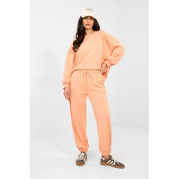 Elegantní set trenýrek v casualovém provedení je ideálním návrhem pro každodenní styling. Hladký vzor mu dodává univerzální charakter, díky čemuž se skvěle hodí jak k relaxaci, procházkám, tak i do městských outfitů. Mikina s dlouhým rukávem a kulatým výstřihem poskytuje pohodlí a nadčasový vzhled. Další výhodou je decentní nášivka umístěná na levém rukávu, která dodává celku moderní akcent. Kalhoty s dlouhými nohavicemi zakončenými lemy se skvěle přizpůsobují postavě. Vysoký pas zdůrazňuje pas a zvyšuje pohodlí nošení, boční kapsy s kapsami dodávají funkčnost. Set je vyroben z měkké a elastické směsi viskózy a elastanu, což zaručuje pohodlí nošení, volnost pohybů a ideální přizpůsobení postavě. Jedná se o pohodlný a stylový set na každý den. Materiál typu máslo je měkký, jemný a mimořádně příjemný na dotek.