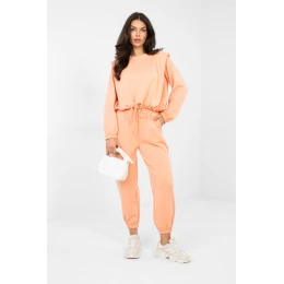 Dámský teplý set skládající se z mikiny a kalhot je skvělým návrhem pro každodenní nošení pro ženy, které ocení pohodlí a uvolněný, casualový styl. Hladký materiál zdůrazňuje minimalistický charakter setu a dělá ho mimořádně univerzálním. Vyrobený z vysoce kvalitní směsi viskózy a elastanu, ohromí tkanina typu "máslo" měkkou, jemnou a mimořádně příjemnou na dotek. Materiál krásně padne na postavě, je elastický a zaručuje maximální pohodlí při nošení po celý den. Mikina s dlouhým rukávem a klasickým, kulatým výstřihem má šňůrku dole, která umožňuje regulaci a decentní zdůraznění pasu. Kalhoty s vysokým pasem a elastickým pásem zajistí perfektní přizpůsobení. Dlouhé nohavice zakončené lemováním dodávají sportovní charakter a boční kapsy zvyšují funkčnost. Jedná se o ideální volbu pro každodenní výlety, procházky nebo relaxaci v domácím prostředí - stylový, pohodlný a mimořádně příjemný set, který s