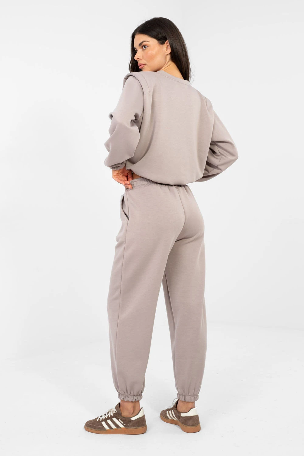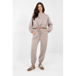 Dámský teplákový set skládající se z mikiny a kalhot je skvělým návrhem na každodenní nošení pro ženy, které ocení pohodlí a uvolněný, ležérní styl. Hladký materiál zdůrazňuje minimalistický charakter setu a činí ho mimořádně univerzálním. Vyrobený z vysoce kvalitní směsi viskózy a elastanu, ohromuje tkaninou typu "máslo" jemnou, hebkou a mimořádně příjemnou na dotek. Materiál krásně padne na postavu, je elastický a zajišťuje maximální pohodlí při nošení po celý den. Mikina s dlouhým rukávem a klasickým, kulatým výstřihem má šňůrku na spodním okraji, která umožňuje regulaci a jemné zdůraznění pasu. Kalhoty s vysokým pasem a elastickým pásem zaručují dokonalé přizpůsobení. Dlouhé nohavice s manžetami na konci dodávají sportovní charakter, a boční vložené kapsy zvyšují funkčnost. Jedná se o ideální volbu na každodenní vycházky, procházky nebo relaxaci v domácím útulku. Stylový, pohodlný a mimořádně p
