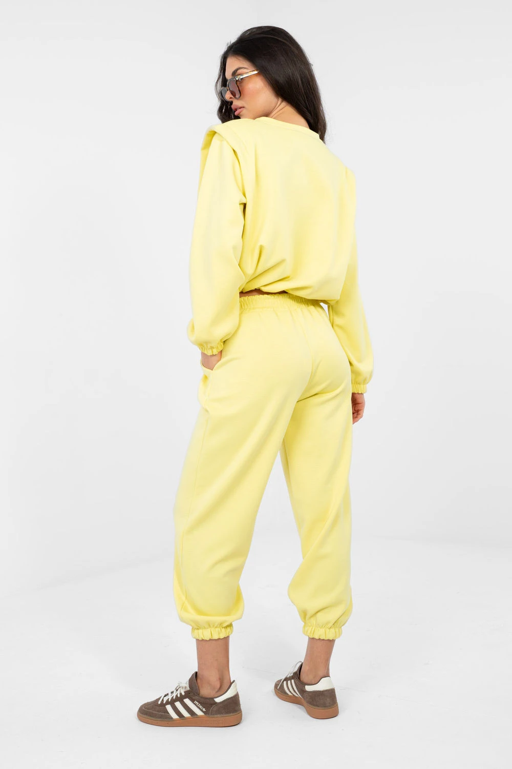 Kompletní dámský teplákový set skládající se z mikiny a kalhot je skvělým návrhem na každý den pro ženy, které ocení pohodlí a volný, casual styl. Hladký materiál zdůrazňuje minimalistický charakter setu a činí ho mimořádně univerzálním. Vyrobený z vysoké kvality směsi viskózy a elastanu, okouzlí látkou typu "máslo" jemnou, něžnou a mimořádně příjemnou na dotek. Materiál se krásně přizpůsobuje postavě, je elastický a poskytuje maximální pohodlí při nošení po celý den. Mikina s dlouhým rukávem a klasickým, kulatým výstřihem má šňůrku dole, která umožňuje regulaci a jemné zdůraznění pasu. Kalhoty s vysokým pasem a elastickým pásem zaručují ideální přizpůsobení. Dlouhé nohavice zakončené manžetami dodávají sportovní charakter, a boční kapsy zvyšují funkčnost. Je to ideální volba pro každodenní vycházky, procházky nebo odpočinek v domácím útulku stylový, pohodlný a mimořádně příjemný na nošení set,