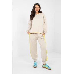 Stylový set se skládá z mikiny a kalhot a je ideální volbou pro každodenní nošení pro ty, kteří ocení pohodlí v módním provedení. Vyrobený z vysoce kvalitní směsi polyesteru, viskózy a elastanu, materiál je měkký, elastický a příjemný na dotek, poskytující pohodlí po celý den. Mikina s klasickým kulatým výstřihem a dlouhým rukávem skvěle zapadá do casualového stylu. Hladký vzor dává celku univerzální charakter, díky čemuž je snadné set sladit s různými doplňky. Kalhoty s vysokým pasem mají v pase praktické šňůrky, které umožňují individuální přizpůsobení. Model s dlouhými nohavicemi zakončenými manžetami poskytuje pohodlí a sportovní vzhled. Boční kapsy zvyšují funkcionalitu a módní pruhy po bocích nohavic dodávají celku dynamický a moderní akcent. Jedná se o skvělou volbu na každodenní vycházky, procházky nebo relaxaci v domácím útulku spojení pohodlí a stylu v jednom setu.