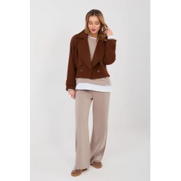 Dvoudílný oblek ve stylu casual je skvělou volbou pro ženy, které ocení pohodlí a moderní minimalismus. Hladký vzor zdůrazňuje univerzální charakter setu, díky čemuž se skvěle hodí jak na každodenní vycházky, tak i pro domácí pohodu. Vyrobený z vysoce kvalitní směsi polyesteru, viskózy a elastanu, set poskytuje pohodlí nošení, elasticitu a příjemné přizpůsobení se postavě. Materiál je měkký, odolný a odolný proti mačkání, což zajišťuje, že set si zachová estetický vzhled po dlouhou dobu. Mikina s dlouhým rukávem je dokončena kontrastními vložkami, které dodávají celku módní charakter. Dalším akcentem je nášivka umístěná vpředu, vlevo dole, zdůrazňující moderní styl setu. Kalhoty s dlouhou délkou a přímými nohavicemi a vysokým pasem krásně tvarují postavu a zajišťují pohodlí nošení. V pase jsou šňůrky k zavázání, umožňující ideální přizpůsobení, a boční kapsy zvyšují funkčnost setu. Jedná se o stylový