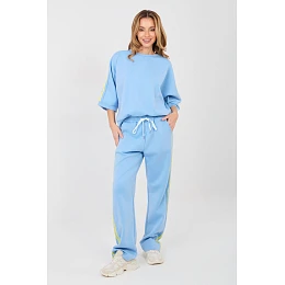 Dámský teplákový set skládající se z mikiny a kalhot, ideální pro každodenní volnočasový styl. Hladký vzor činí set univerzálním a snadno kombinovatelným s různými příležitostmi, od procházek přes nákupy až po domácí relaxaci. Set je vyroben z příjemné směsi polyesteru, viskózy a elastanu. Materiál typu "máslo" je mimořádně měkký, jemný a velmi příjemný na dotek, což zaručuje vysoký komfort nošení a volnost pohybu. Kalhoty mají vysoký pas a dlouhé rovné nohavice, které se dobře přizpůsobují postavě. V pasu mají praktické šňůrky pro přizpůsobení figuře. Model je také vybaven pohodlnými bočními kapsami. Mikina s rukávy po lokty dokonale doplňuje celý set. Dalším dekorativním prvkem jsou módní pruhy po rukávech a nohavicích, které dodávají setu sportovní a moderní charakter.