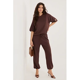 Dámský teplákový set skládající se z mikiny a kalhot je ideální nabídkou pro ženy, které ocení pohodlí a moderní styl na každý den. Hladký střih mu dodává univerzální charakter, díky čemuž se skvěle hodí jak do domácích outfitů, tak i na vycházky do města. Mikina s krátkým rukávem a klasickým kulatým výstřihem zajistí pohodlí nošení a volnost pohybů. Dalším akcentem je nášivka na rukávu, která celku dodává módní vzhled. Kalhoty s dlouhými nohavicemi ukončené lemy se skvěle přizpůsobí postavě. Model je vybaven praktickými bočními kapsami, které zvyšují funkcionalitu. Set je vyroben z příjemné směsi viskózy a elastanu, což zaručuje pohodlí, pružnost a ideální přizpůsobení. Model bez zapínání, což dále zdůrazňuje jeho volný, pohodlný charakter.