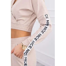Predstavujeme vám sadu mikiny a nohavíc. Mikina a nohavice majú ozdobnú stuhu s nápisom. V spodnej časti mikiny je všitá guma. Nohavice s vreckami. Veľmi módna a štýlová sada. Súprava je vyrobená z vysoko kvalitného materiálu. Veľkosť je univerzálna a vyhovuje dámam veľkosti S, M alebo L.
