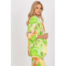 Bunda rovného strihu z farebnej látky s podšívkou. Vankúše a záhyby na ramenách. Sako s 3/4 rukávmi, bez gombíka. K súprave sa hodia nohavice rovnakej farby.