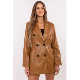 Elegantní dámský blejzer z ekokože je jedinečným prvkem šatníku, který kombinuje klasiku s moderním charakterem. Vyrobený z odolné směsi polyesteru a polyuretanu vypadá velmi elegantně, zároveň je praktický a snadno se udržuje. Díky podšívkce poskytuje pohodlí nosit i v chladnějších dnech, což z ní činí ideální volbu na podzim, zimu a jaro. Blejzer s průměrnou délkou se vyznačuje širokými límci, které dodávají nadčasový šarm, a vestavěnými polštářky na ramenou, které zdůrazňují postavu a dodávají jí strukturu. Dvojitý řadový závěr na knoflíky posiluje elegantní charakter tohoto modelu, a ozdobné zástřihy v pasu opticky zúžují postavu, dodávají blejzeru ženský výraz. Je to skvělá volba na různé příležitosti, od každodenních outfitů po slavnostní setkání nebo pracovní dny. Blejzer skvěle ladí jak s elegantními kalhotami, tak s džíny, umožňuje vytvářet různorodé, stylové kombinace.