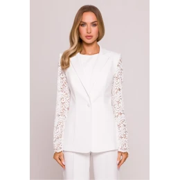 Elegantné sako, ktoré spája nadčasový tvar s modernými detailmi. Je vyrobené z hladkej, vysokokvalitnej tkaniny a obohatené o dlhé rukávy z elastickej čipky, ktoré mu dodávajú ľahkosť a ženský charakter. Klasický golier s golierovými manžetami a zapínanie na jeden gombík vpredu mu dodávajú elegantný a vyvážený vzhľad. Absencia vreciek zdôrazňuje čistotu tvaru a mierne vypasovaný strih s rovným lemom sa krásne prispôsobí postave a zvýrazní jej prednosti. Vďaka dĺžke po boky je skvelou voľbou na formálny štýl aj modernejšie kombinácie, napríklad s džínsami alebo sukňou. Navrhnuté a vyrobené v Poľsku s dôrazom na detail a kvalitné spracovanie. Čipka 90 % nylon, 10 % spandex.