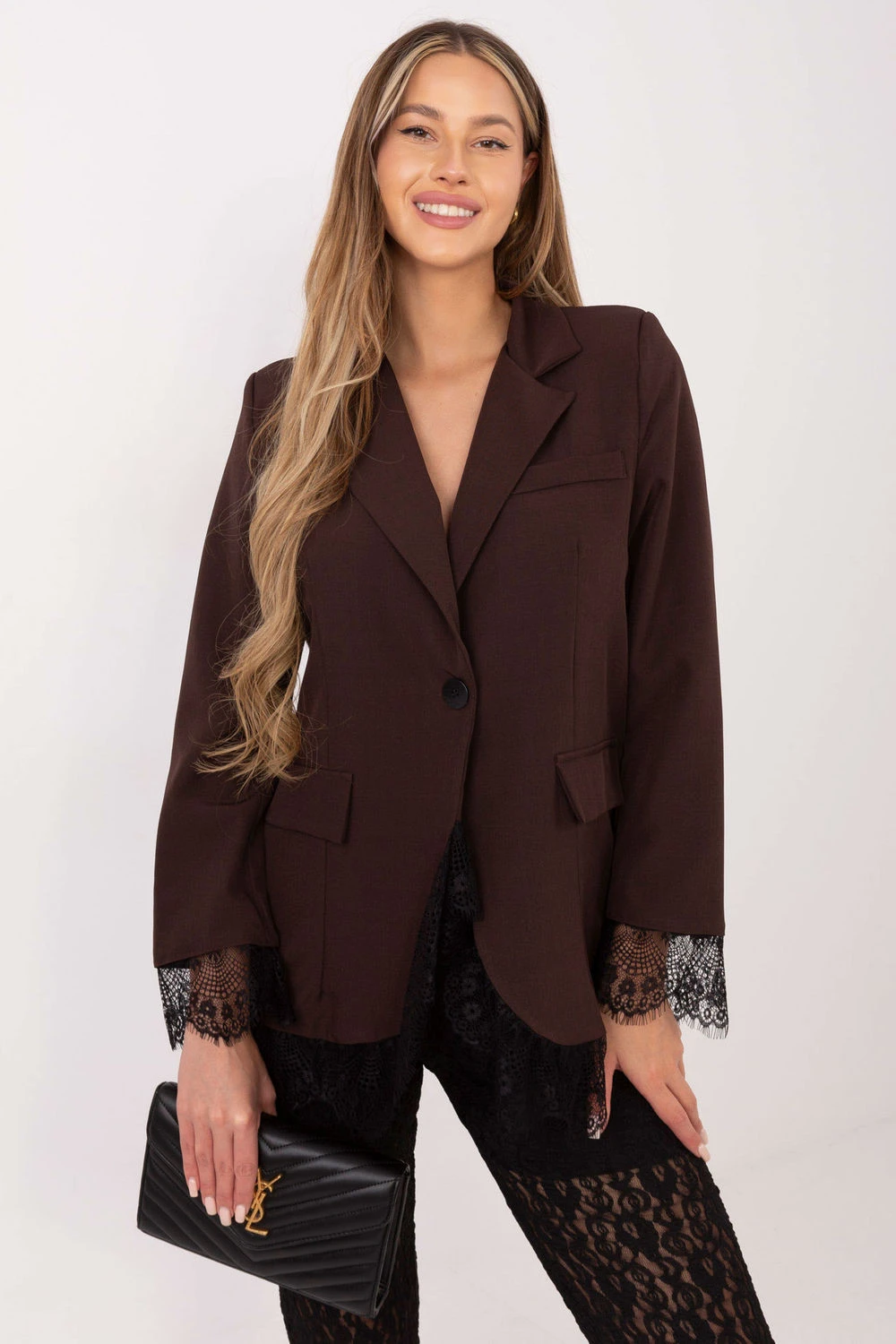Elegantné dámske sako v nadčasovom, klasickom štýle, ideálne na formálne udalosti, do práce aj na večierok. Hladký strih podčiarkuje jeho univerzálny charakter a jemné detaily dodávajú celku výnimočnú eleganciu. Model je vyrobený z kvalitného polyesteru s prídavkom elastanu, ktorý zaručuje odolnosť, pružnosť a pohodlie pri nosení. Štandardná dĺžka a dlhé rukávy zdobené jemnou čipkou sa nádherne kombinujú s čipkovým lemom v spodnej časti saka, čo mu dodáva ženský a štýlový vzhľad. Sako má zapínanie na jeden gombík a podšívku, ktorá zvyšuje pohodlie pri nosení a robí celkový vzhľad dokonalým. Je skvelou voľbou pre ženy, ktoré chcú spojiť klasickú eleganciu s jemnou dávkou romantiky. elastan 5 %