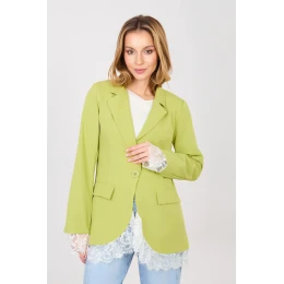 Elegantní dámský sako standardní délky navržené pro ženy, které si cení nadčasového stylu a univerzálnosti. Model s hladkým zpracováním se skvěle hodí jak do pracovních stylizací, tak na schůzky nebo každodenní nošení. Sako má vestavěné ramenní polštářky, které jemně zdůrazňují linii siluety a dodávají jí výrazný elegantní charakter. Klopové límce dodávají třídu a jednořadé zapínání na knoflík zajišťuje pohodlí a estetické přizpůsobení. Imitace kapes pod patkami zdůrazňují formální styl modelu, zachovávajíce přitom jeho lehkost. Dlouhý rukáv a spodní lem saka byly pečlivě opatřeny jemnou krajkou, která přidává ženský a originální akcent. Model má podšívku, co zvyšuje pohodlí nošení a zajišťuje, že sako se perfektně přizpůsobuje postavě. Vyrobený z vysoce kvalitní směsi polyesteru s přídavkem elastanu, zaručuje trvanlivost, pružnost a volnost pohybů. Ideální volba pro ženy, které hledají elegantní a