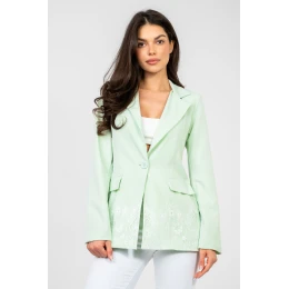 Elegantní dámský sako standardní délky, navržené pro ženy, které oceňují nadčasový styl a všestrannost. Model s hladkým dokončením se skvěle hodí jak do pracovního stylu, na schůzky, tak i na večírek nebo každodenní nošení. Sako má vestavěné polštářky na ramenou, které jemně zdůrazňují linii postavy a dodávají jí výrazný, elegantní charakter. Obrácené límce přidávají eleganci, a jednořadé zapínání na knoflík zajišťuje pohodlí a estetické přizpůsobení. Imitace kapes pod patkami zdůrazňují formální styl modelu, zachovávajíce přitom jeho lehkost. Dlouhý rukáv a dolní lem saka jsou pečlivě lemovány jemnou krajkou, která přináší ženský a originální akcent. Model má podšívku, co zvyšuje pohodlí nošení a zajišťuje, že sako se skvěle tvaruje na postavě. Vyrobena z vysoce kvalitní směsi polyesteru s přídavkem elastanu, zaručuje trvanlivost, pružnost a volnost pohybů. Ideální volba pro ženy, které hledají elega