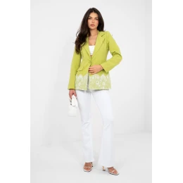 Elegantní dámský sako s nadčasovým, elegantním charakterem. Hladký vzor dělá model univerzálním a snadno stylizovatelným, skvěle ladí jak s elegantními kalhotami, sukní, tak i s džínovinami ve více každodenním provedení. Model standardní délky s dlouhým rukávem, zapínán jednořadě na knoflík, krásně zdůrazňuje siluetu. Vložené polštářky na ramenou dodávají konstrukci výraznosti a jemně modelují linii ramen, přidávají celku profesionální charakter. Sako má podšívku, díky čemuž se pohodlně nosí a je pohodlné. Dole je ozdobně zakončeno nášivkou z krajky, která dodává ženský, jemný akcent a vyzdvihuje model na pozadí klasických střihů. Vyrobeno z odolné a elastické směsi polyesteru s přídavkem elastanu, zajišťuje pohodlí a volnost pohybů. Ideální volba pro ženy, které hledají elegantní sako s decentním, dekorativním detailem.