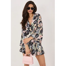 Elegantný dámsky blejzer s výnimočnou kvetinovou potlačou, ktorý dokonale spája klasiku s moderným štýlom. Je ideálny na rôzne príležitosti, hodí sa do práce, na obchodné stretnutia aj na večierky a dodáva stylingu ženský nádych. Strih krásne zvýrazňuje siluetu a zapínanie na dva gombíky v jednom smere dodáva celku nadčasovú eleganciu. Široké rukávy s 3/4 dĺžkou prinášajú ľahkosť a nenápadný módny akcent. Model je vyrobený z kvalitnej zmesi polyesteru a elastanu, ktorá zaručuje pohodlie pri nosení a dobré prispôsobenie sa siluete. Blejzer je podšitý, čo zvyšuje komfort nosenia a vďaka čomu sa dokonale prispôsobí telu.