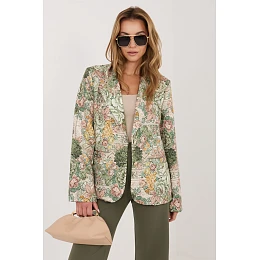 Elegantní dámský sako standardní délky navržené s ohledem na styl a pohodlí. Model se vyznačuje efektním květinovým potiskem, který dodává celku ženský a trendy charakter. Vyrobeno z vysoce kvalitní směsi polyesteru s přídavkem elastanu, díky čemuž je materiál lehce elastický a pohodlný na nošení. Sako má dlouhý rukáv a klasické límce, které zdůrazňují jeho nadčasový střih. Zapíná se na jednořadé knoflíky, co mu dodává elegantní a upravený vzhled. Další výhodou je podšívka, která zvyšuje komfort nošení a estetiku dokončení. Vložené polštářky na ramenou jemně tvarují siluetu, dodávají jí výraznější linii. Ideální jak do kanceláře, tak do běžného nošení, skvěle ladí s elegantními kalhotami, sukní nebo džíny. elastan 5%