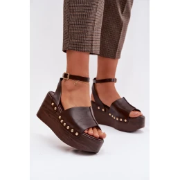Elegantní dámské sandály z ekokůže jsou spojením pohodlí a výrazného vzhledu. Model umístěný na platformě spojené s klínem poskytuje stabilitu a pohodlí nošení, zároveň jemně zdůrazňuje postavu. Pásek zapínající se kolem kotníku zajistí dobré přizpůsobení a stabilitu, zlaté hřebíky umístěné po stranách dodávají celku módní a efektní charakter. Tyto sandály se skvěle hodí do letních stylizací.
