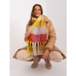 Žltý a bordový zimný šál s károvanými strapcami.