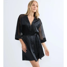 Tento zmyselný župan je navrhnutý tak, aby prebúdzal túžbu a sľuboval nezabudnuteľné okamihy. Trojštvrťové široké rukávy a jemné čipkové panely na chrbte dodávajú rafinovaný, no zároveň zvodný detail. Tento župan je vyrobený z lesklého saténu z 90 % recyklovaného nylonu a má certifikát GRS.