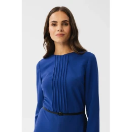 65% polyester 30% viskóza 5% elastan DETAILY PRODUKTU: šaty z tkané látky s ozdobnými svislými záševky v přední části dlouhé rukávy spona pásek z umělé kůže součástí balení délka pod kolena a šikmý střih sukně bez podšívky skrytý zip na zádech naše modelka měří 174 cm a nosí velikost S navrženo a vyrobeno v Polsku