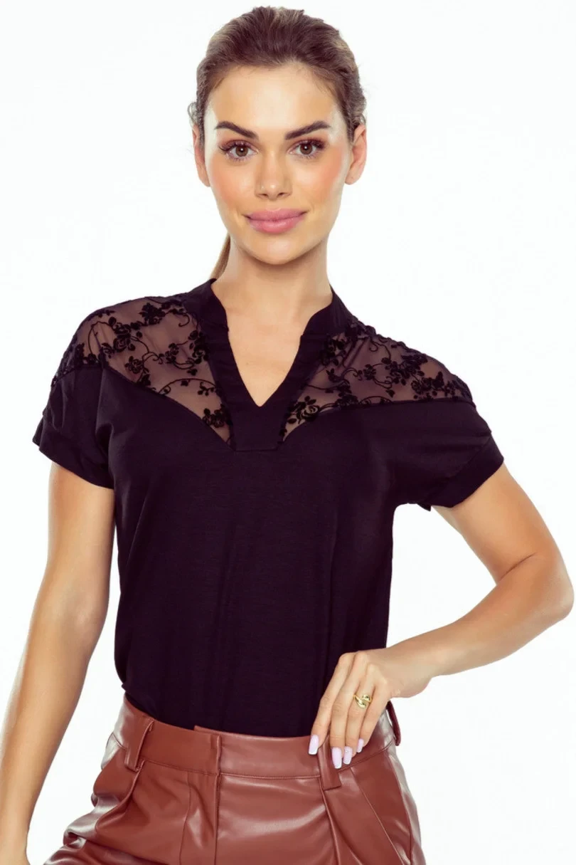 Sefora to stylowa bluzka damska od renomowanej marki Eldar, która zachwyca swoim wyrafinowanym designem. Klasyczny krój z krótkim rękawem został ozdobiony koronkowymi detalami, które podkreślają kobiecy charakter tej bluzki. Wysokiej jakości wiskoza (85%) w połączeniu z elastanem i poliamidem zapewnia wygodę i perfekcyjne dopasowanie. Idealna na co dzień, do pracy lub na wieczorne wyjścia – Sefora to model, który zachwyci każdą kobietę.