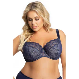 Elegantná vystužená podprsenka z čipky. Spodná časť košíčka je polstrovaná mäkkou penou, ktorá je navyše z vnútornej strany košíčka podšitá bavlnou, čo výrazne zvyšuje komfort používania. Horná časť košíčkov je vyrobená z čipky podšitej jemnou sieťovinou, ktorá nie je elastická, takže podprsenka krásne priľne k poprsiu. Celkový efekt je, že prsia sú dokonale zhrnuté dovnútra, pozdvihnuté a udržujú si krásny, zaoblený tvar. Mostík je tiež vyrobený z čipky a stred podprsenky, ktorý k nemu dokonale prilieha, je ozdobený drobnou mašličkou. Popruhy sú nastaviteľné, neodnímateľné a rôzne široké v závislosti od veľkosti. Zvislé veľrybie kosti na bokoch. Zapínanie: dvojradové a trojradové zapínanie na háčiky a očká, v závislosti od veľkosti, s trojstupňovým nastavením obvodu.