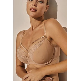 Položtvrdný podprsenka Isla BC-928 je model, který kombinuje elegantní provedení s pohodlím nošení každý den. Tenká pěna jemně tvaruje poprsí, zůstává lehká a téměř necitelná na těle. Konstrukce byla navržena tak, aby efektivně zdvihla prsa a dodala jim estetický, přirozený tvar. Horní část misek zdobí spojení krajky a síťoviny, co dává celku decentní, ženský charakter. Model je k dispozici v širokém rozsahu velikostí od A do K, což umožňuje snadné přizpůsobení různým typům postav. Ozdobné ramínka s prvky ve zlaté barvě, včetně kroužků a regulátorů, přidávají jemný dekorační prvek. Boční díly vyrobené z prodyšné síťoviny, zakončené elastickým páskem, zajistí stabilitu a pohodlí nošení. Nastavitelná, neodnímatelná ramínka umožňují individuální přizpůsobení, a zapínání na dvojitou háčkovou je zárukou pohodlí při každodenním používání.