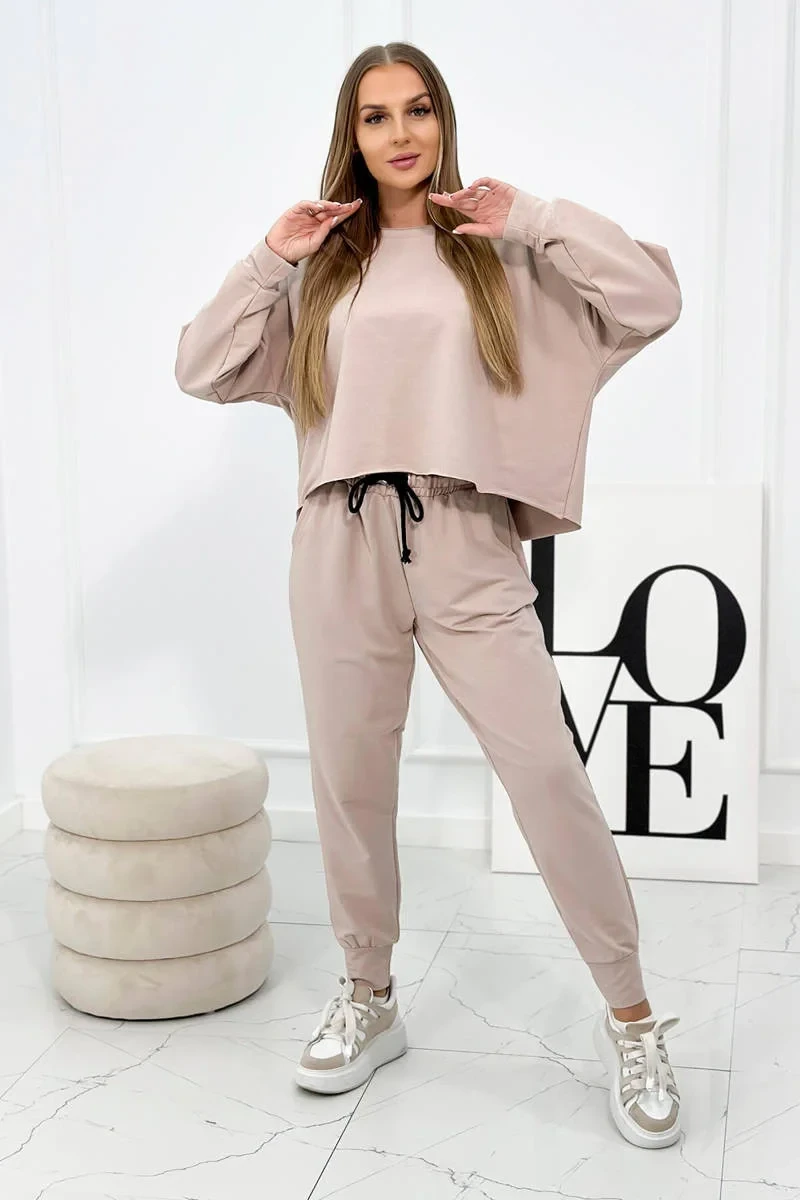 Prezentujemy Państwu komplet 2-częściowy. Komplety składa się z bluzy oraz spodni. Bluza oversize, gładka bez nadruków. Spodnie z kieszeniami i wiązaniem w pasie. Komplet wykonany jest z wysokiej jakości materiału. Rozmiar jest uniwersalny i będzie odpowiedni dla Pań w rozmiarze S lub M.