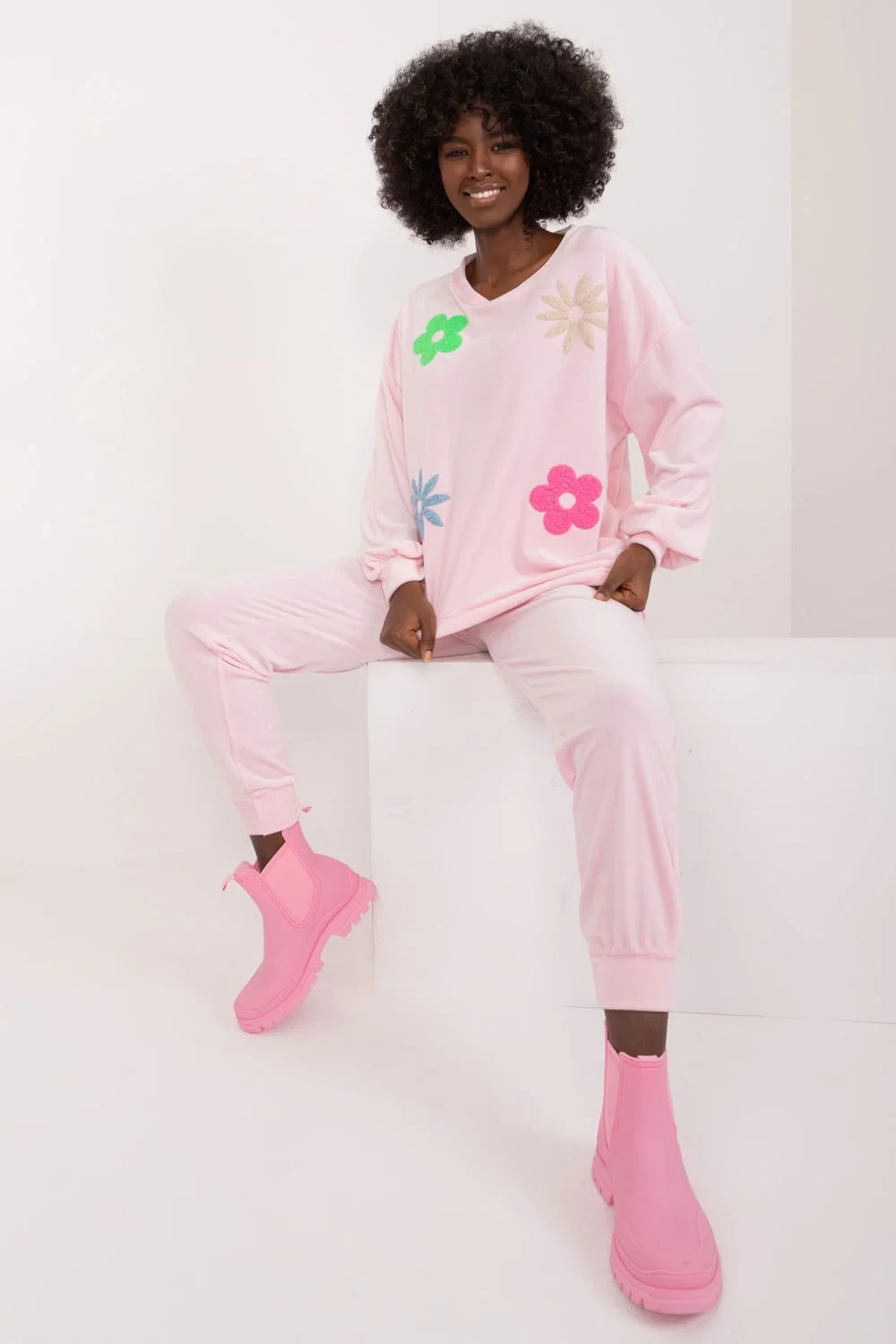 Velurová souprava, která se skládá z mikiny a kalhot, je kombinací elegance a pohodlí, ideální pro neformální chvíle odpočinku. Tato souprava, vytvořená s ohledem na pohodlí při nošení a módní vzhled, jistě upoutá pozornost svým jedinečným designem. Převažujícím materiálem je měkký polyester, který v kombinaci s velurovou úpravou poskytuje příjemný pocit na kůži. Soupravu zdobí na přední straně potisk květin, který jí dodává svěží a romantický nádech, ideální pro letní večery. Díky standardní délce halenky a kalhot je souprava praktická a univerzální. Stylizované žebrování na nohavicích kalhot dodává moderní, sportovní vzhled a zároveň umožňuje volnost pohybu. Kalhoty s vysokým pasem zvýrazňují pas, zatímco boční nakládané kapsy na kalhotách jsou praktické a stylové zároveň. Mikina s dlouhými rukávy a kulatým výstřihem je pohodlná a vhodná pro každodenní nošení. Celek vytváří harmonický obraz, v němž se elastan 5%Polyester 95%