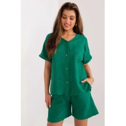 Táto elegantná a zároveň ležérna dámska súprava pozostáva z trička a šortiek a je ideálna na každodenné výlety. Hladký dizajn a kombinácia bavlny a polyesteru zaručujú pohodlie a odolnosť. Šortky s dĺžkou po kolená, širokými nohavicami a vysokým pásom zvýrazňujú siluetu, zatiaľ čo bočné vrecká dodávajú praktickosť. Krátke rukávy a výstrih do V dodávajú tričku ľahký a letný štýl, zatiaľ čo gombíky na prednej strane umožňujú jednoduché obliekanie. Ide o ideálnu voľbu na teplé dni, ktorá spája pohodlie a módny vzhľad.
