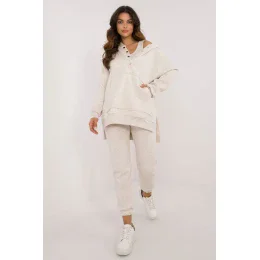 Zateplená dámská souprava v ležérním stylu, ideální pro chladnější dny a každodenní vycházky, se skládá z trička, mikiny a kalhot. Souprava se vyznačuje melanžovým vzorem, který jí dodává jedinečný nádech. Je vyrobena převážně z bavlny a poskytuje pohodlí a teplo, ideální pro podzimní a zimní dny. Kalhoty mají dlouhé nohavice s žebrovanými lemy a vysoký střih, který zvýrazňuje siluetu a zaručuje pohodlné nošení. V pase je stahovací šňůrka pro dokonalé přizpůsobení a zasouvací boční kapsy jsou praktickým řešením pro drobnosti. Mikina s dlouhým rukávem se zapíná do poloviny pomocí patentek, což jí dodává originalitu a usnadňuje oblékání. Má také kapuci a velkou klokaní kapsu, která dodává sportovní nádech a další funkčnost. Je doplněna klasickým tričkem, čímž vzniká pohodlný a stylový komplet, ideální pro každodenní styling v chladnějších dnech.