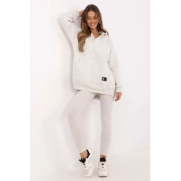 Dámský set skládající se z krátkého topu, dlouhé mikiny a legín je kombinací pohodlí a stylu, která se hodí jak do každodenních, tak sportovních outfitů. Udržovaný v casualovém a sportovním stylu perfektně padne na procházku, trénink nebo relaxační den doma. Mikina s prodlouženým střihem je praktickým a módním prvkem setu. Vyrobena z teplé směsi bavlny a polyesteru poskytuje teplo a komfort v chladnějších dnech. Vybavena prostornou kapucí, dlouhým rukávem a kapsou typu klokaní, je nejen funkční, ale také stylová. Výstřih ve tvaru písmene V jí dodává originální vzhled a nášivka na přední straně přidává charakteru. Top s klasickým, kulatým výstřihem je vyroben z bavlny s příměsí elastanu, což zaručuje pohodlí a skvělé přizpůsobení tělu. Kratší střih zdůrazňuje siluetu, ideálně ladí s vysokým pasem legín. Legíny s zužujícími se nohavicemi a vysokým pasem zajišťují pohodlí a volnost pohybu. Jejich elastický materiál