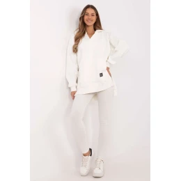 Dámský set skládající se z krátkého topu, dlouhé mikiny a legín je kombinací pohodlí a stylu, která se hodí do každodenních i sportovních outfitů. Udržován v casual a sportovním stylu, skvěle se hodí na procházku, trénink nebo relaxační den doma. Mikina s prodlouženým střihem je praktickým a módním prvkem setu. Vyrobená z teplé směsi bavlny a polyesteru, poskytuje teplo a pohodlí v chladnějších dnech. S prostornou kapucí, dlouhým rukávem a kapsou typu klokaní není jen funkční, ale i stylová. Výstřih ve tvaru písmene V jí dodává originální vzhled a nášivka na přední straně přidává charakteru. Top s klasickým, kulatým výstřihem je vyroben z bavlny s příměsí elastanu, což zaručuje pohodlí a dokonalé přizpůsobení tělu. Kratší střih zdůrazňuje siluetu, skvěle ladí s vysokým pasem legín. Legíny se zúženými nohavicemi a vysokým pasem zajišťují pohodlí a volnost pohybu. Jejich elastický materiál vyrobený z bavlny s př