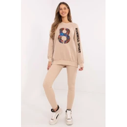 Dámský set skládající se z mikiny a legín je skvělým návrhem na každodenní, neformální stylizace. Ideální pro ženy, které ocení pohodlí a zároveň chtějí vypadat módně a stylově. Mikina klasického střihu s kulatým výstřihem a dlouhým rukávem je vyrobena z vysoce kvalitní směsi bavlny, polyesteru a elastanu. Je příjemná na dotek, elastická a odolná, což zajišťuje pohodlí při nošení po celý den. Subtilní nášivky a vyšívání na rukávu a přední části jí dodávají zvláštní charakter, zdůrazňující moderní design. Legíny se zúženými nohavicemi a vysokým pasem jsou ideálním doplňkem k setu. Vyrobené z bavlny s příměsí elastanu se perfektně přizpůsobují postavě, poskytují plnou volnost pohybu a pohodlí. Celý set je v hladkém vzoru, což ho činí univerzálním a snadno kombinovatelným s různými doplňky. Skvělá volba na každodenní vycházky, relaxaci nebo aktivity v uvolněném stylu. Složení materiálu: Mikina: 72 %