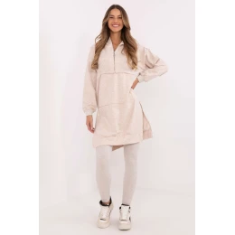 Dámský set skládající se z dlouhé mikiny a legín je ideální volbou pro každodenní stylování v casual stylu. Praktický, pohodlný a stylový, skvěle poslouží při procházkách, setkáních s přáteli nebo relaxaci v domácím prostředí. Mikina s prodlouženým střihem vyrobená z měkké a elastické směsi bavlny a elastanu zajišťuje maximální pohodlí při nošení. Vybavena prostornou kapucí a dlouhým rukávem, skvěle se hodí do chladnějších dnů. Kapsa typu klokánek vpředu dodává funkcionalitu a casual charakter. Legíny s rozšiřujícími se nohavicemi a vysokým pasem zdůrazňují postavu a zároveň zaručují plnou volnost pohybu. Vyrobené z bavlny s přídavkem elastanu se ideálně přizpůsobují tělu, zajišťují pohodlí po celý den. Set udržovaný v hladkém vzoru tvoří harmonický celek, který lze snadno doplnit oblíbenými doplňky. Jedná se o skvělé řešení pro ženy, které si cení stylu a pohodlí každý den.