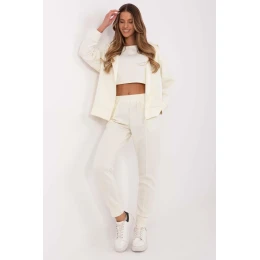 Stylový a pohodlný teplákový set, který spojuje pohodlí s moderním designem. Sada se skládá z krátkého trička, mikiny s kapucí a dlouhých kalhot, díky čemuž je ideální volbou jak na každý den, tak i na sportovní aktivity. Vyrobený z směsi bavlny, elastanu, polyesteru a viskózy, poskytuje měkkost, elasticitu a dostatečnou prodyšnost. Hladký vzor mu dodává univerzální charakter, skvěle zapadající do každodenních i sportovních stylizací. Tričko s krátkým rukávem a kulatým výstřihem se skvěle hodí k mikině s dlouhým rukávem a praktickou kapucí, která poskytuje dodatečnou ochranu před chladem. Kalhoty s vysokým pasem a manžetami na nohou zaručují pohodlné padnutí, a postranní kapsy s průchody přidávají funkčnost. Je to ideální souprava pro ženy, které ocení pohodlí, sportovní styl a módní vzhled v každé situaci!