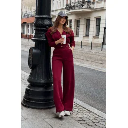 Táto dámska súprava je štýlovou a pohodlnou kombináciou elegancie a každodenného pohodlia. Voľný sveter so srdcovým výstrihom a zapínaním na gombíky poskytuje voľnosť pohybu a dokonale sa prispôsobí postave. Široký spodný lem dodáva štruktúru a jemne zvýrazňuje pás. Široké nohavice sú vrcholom pohodlia a elegancie, so vsadenými vreckami na bokoch a elastickým pásom, ktorý zaručuje ideálne prispôsobenie. Súprava je vyrobená z mäkkého, na dotyk príjemného materiálu a je vhodná na každodenné nosenie, ako aj na elegantnejšie štýly. Možno ju nosiť spolu alebo kombinovať s inými kúskami oblečenia, čím sa vytvoria nekonečné módne kombinácie.