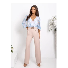 Elegantný a štýlový komplet, ktorý zaujme jemnou kombináciou farieb. Vzdušná blúzka s jemným pestrofarebným vzorom (modrá, béžová) dodáva stylingu ľahkosť a ženskú eleganciu. Lodičkový výstrih krásne zvýrazňuje krk a voľnejší strih zaručuje pohodlné nosenie. Nohavice v jednofarebnej béžovej farbe dokonale dopĺňajú celkový vzhľad, elastický pás zaručuje ideálne prispôsobenie a opasok s ozdobnou sponou zvýrazňuje pás. Táto harmonická kombinácia klasiky a moderny je ideálna na každú príležitosť.