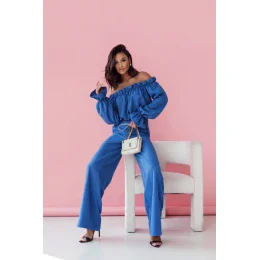 Elegantná a ženská dámska súprava, ktorá spája klasiku s jemnými detailmi. Blúzka s dlhými rukávmi zakončená volánom dodáva ľahkosť a romantiku a španielsky výstrih krásne zvýrazňuje ramená a dekolt, čím dodáva oblečeniu zmyselný charakter. Nohavice s vysokým pásom zvýrazňujú pás a predlžujú nohy, zapínajú sa na boku na skrytý zips, čo dodáva moderný nádych. Na bokoch sú praktické vrecká, ktoré spájajú funkčnosť s elegantným vzhľadom. Je to dokonalá súprava na špeciálne príležitosti, ktorá spája pohodlie s módnym dizajnom.