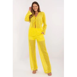 Stylový a pohodlný průsvitný dámský komplet je skvělou volbou pro každodenní nošení pro ženy, které ocení módní vzhled a pohodlí. Vyrobený z prodyšné směsi bavlny, elastanu a polyesteru poskytuje pohodlí a skvělé padnutí. Košile s dlouhým rukávem a šněrováním vpředu místo knoflíků dodává stylizaci lehkost a jemnou eleganci. Kalhoty s rovným střihem a vysokým pasem zjemňují postavu a boční vsunuté kapsy dodávají funkčnost. Navíc horní část kalhot je vybavena podsadou, což zajišťuje pohodlí při nošení. Průsvitný vzor dodává celku jedinečný ženský charakter, skvěle zapadající do každodenního volného stylu. Komplet se skvěle hodí jak do každodenních outfitů, tak do lehkých letních looků.