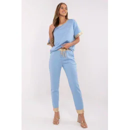Elegantná a pohodlná dámska súprava, ideálna na každý deň. Je vyrobená z vysokokvalitnej zmesi viskózy, bavlny a elastanu a poskytuje pohodlné nosenie a voľnosť pohybu. Hladký materiál jej dodáva elegantný minimalizmus, zatiaľ čo zlaté detaily na nohaviciach, rukávoch a výstrihu dodávajú decentnú eleganciu. Blúzka má krátke rukávy a klasický okrúhly výstrih, zatiaľ čo nohavice s vysokým pásom a bočnými vreckami zabezpečujú pohodlie a praktickosť. Dlhé nohavice s elastickými lemami zdôrazňujú ležérny charakter súpravy. Ideálna voľba pre ženy, ktoré oceňujú štýl a pohodlie v každodennom oblečení.