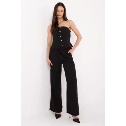 Stylový dámský komplet skládající se z vesty a kalhot je vynikající volbou pro ženy, které ocení eleganci s nádechem modernosti. Ideální na denní nošení, do práce, na společenské akce či večírky, hodí se všude tam, kde záleží na stylu a pohodlí. Vesta bez rukávů s španělským výstřihem je ozdobena dekorativními knoflíky vpředu a efektními řaseními na zádech, které dodávají siluetě jemnou lehkost a zvýrazňují ženskou linku. Kalhoty s vysokým pasem a širokými nohavicemi opticky prodlužují nohy a krásně se přizpůsobují pohybu. Boční kapsy dodávají funkčnost, aniž by narušily elegantní charakter soupravy. Vyrobený z hladkého materiálu, kombinace polyesteru a elastanu, komplet zaručuje pohodlí a styl po celý den.