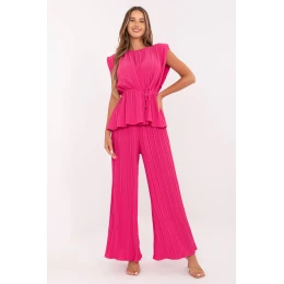 Tento elegantný dámsky komplet z plisovaného materiálu je štýlovou a modernou voľbou na rôzne príležitosti, od každodenných vychádzok až po návštevy alebo pracovné stylingy. Skladá sa z blúzky bez rukávov s okrúhlym výstrihom a nohavíc s dlhými, širokými nohavicami. Hladká štruktúra látky a jemný lesk plisovaného polyesteru dodávajú celku ľahkosť a eleganciu. Nohavice s vysokým pásom krásne zvýrazňujú pás a priložený opasok na zaväzovanie umožňuje dodatočné tvarovanie postavy. Chýbajúce vrecká podčiarkujú elegantný charakter kompletu a zabezpečujú hladké zakončenie línií bokov. Tento komplet je ideálnou kombináciou pohodlia a elegancie, skvelou voľbou pre ženy, ktoré ocenia štýl s nádychom modernej elegancie.