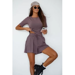 Táto dámska súprava z viskózy s pridaným elastanom je ideálnou kombináciou štýlu a pohodlia. Obsahuje tričko s krátkymi rukávmi a klasickým okrúhlym výstrihom, ktorý jemne zvýrazňuje postavu a zabezpečuje pohodlie pri nosení. Krátke šortky s elastickým pásom a šnúrkou na stiahnutie zabezpečujú dokonalé prispôsobenie a bočné vrecká dodávajú praktickosť. Vďaka ľahkému, priedušnému materiálu s pridaným elastanom je súprava mäkká, pružná a skvelá na každodenné nosenie aj na leňošenie.