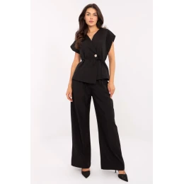 Elegantný dámsky komplet pozostávajúci z vesty a nohavíc, ktorý sa skvele hodí na každý deň, do práce aj na spoločenské udalosti. Je vyrobený z kombinácie viskózy a polyesteru a vyniká hladkou štruktúrou a klasickým charakterom. Vesta so zapínaním na gombíky má krátke rukávy s kapucňou a šnurovaciu pásku, ktorá zvýrazňuje siluetu a dodáva ženský pôvab. Nohavice s vysokým pásom a všitou gumou v páse zaručujú pohodlie a široké nohavice dodávajú ľahkosť a eleganciu. Bočné vrecká umožňujú kombináciu štýlu a funkčnosti, čím vytvárajú moderný a nadčasový komplet.