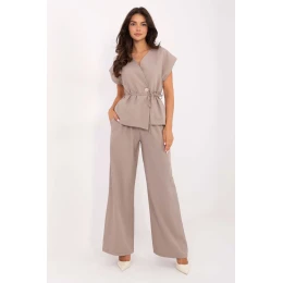 Elegantný dámsky kostým pozostávajúci zo saka a nohavíc, ktorý sa skvele hodí na každý deň, do práce aj na slávnostné udalosti. Je vyrobený zo zmesi viskózy a polyesteru a vyniká hladkou štruktúrou a klasickým charakterom. Sako má zapínanie na gombíky, krátke rukávy s klopou a šnurovaciu pásku, ktorá zvýrazňuje siluetu a dodáva ženský šarm. Nohavice s vysokým pásom a všitou gumou v páse zaručujú pohodlie a široké nohavice dodávajú ľahkosť a eleganciu. Bočné vrecká vytvárajú spojenie štýlu a funkčnosti a vytvárajú moderný a nadčasový komplet.