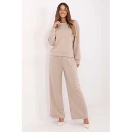 Táto dámska súprava v štýle teplákovej súpravy, vyrobená z mimoriadne mäkkého materiálu maslového typu, je ideálnou kombináciou pohodlia a štýlu na každodenné nosenie. Tkanina zo zmesi viskózy, polyesteru a elastanu je neuveriteľne mäkká, pružná a príjemná na dotyk, takže súprava je ideálna na doma aj do mesta. Súprava pozostáva z voľného trička ležérneho strihu a nohavíc s vysokým pásom, ktoré majú elastický pás na dokonalé prispôsobenie. Široké nohavice dodávajú súprave ľahký a moderný vzhľad a bočné vrecká zdôrazňujú praktický charakter súpravy.